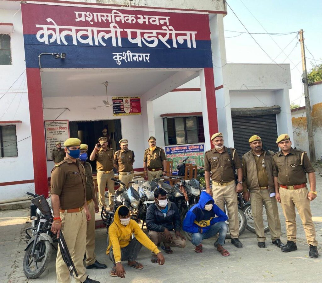 कुशीनगर।पुलिस अधीक्षक के निर्देशन व अपर पुलिस अधीक्षक के पर्यवेक्षण व क्षेत्राधिकारी सदर के नेतृत्व में अपराध एंव अपराधरियों के विरुध्द चलाये जा रहे अभियान के क्रम में थाना को0 पड़रौना पुलिस टीम द्वारा ग्राम त्रिलोकपुर चौराहा बिहार सीमा के पास से 3 शातिर वाहन चोर 1.सिकन्दर सिह पुत्र भागवत सिह साकिन तमकुहा थाना धनहा पश्चिम चम्पारण बिहार, 2.अशोक शाह पुत्र अकलु साह साकिन तमकुहा थाना धनहा पश्चिम चम्पारण बिहार, 3.अमन पाण्डेय पुत्र धर्मेन्द्र पाण्डेय साकिन मुहल्ला शास्त्रिनगर सुभाष चौक कस्बा पडरौना को गिरफ्तार व एक अन्य बाल अपचारी को हिरासत पुलिस में लिया गया जिनके निशादेही पर चोरी की 7 अदद मोटर साईकिल बरामद तथा अभियुक्त सिकन्दर के कब्जे से 1 अदद तमंचा 12 बोर व एक अदद जिन्दा कारतुस 12 बोर बरामद हुआ है। बरामद हुए मोटर साईकिल वाहनों के संबंध में छानबीन की जा रही है। बरामदगी व गिरफ्तारी के आधार पर थाना स्थानीय पर मु0अ0स0 543/21 धारा 41/411,413,419,420,467,468 भा0द0वि0 व मु0अ0सं0 542/21 धारा 3/25 आर्म्स एक्ट बनाम सिन्कदर सिंह पृथक से पंजीकृत कर आवश्यक विधिक कार्यवाही की जा रही है। उक्त वाहन चोर मो0सा0 चोरी के अभ्यस्त अपराधी है तथा अर्न्तजनपदीय स्तर पर मो0सा0 चोरी के अपराध कारित करते है।